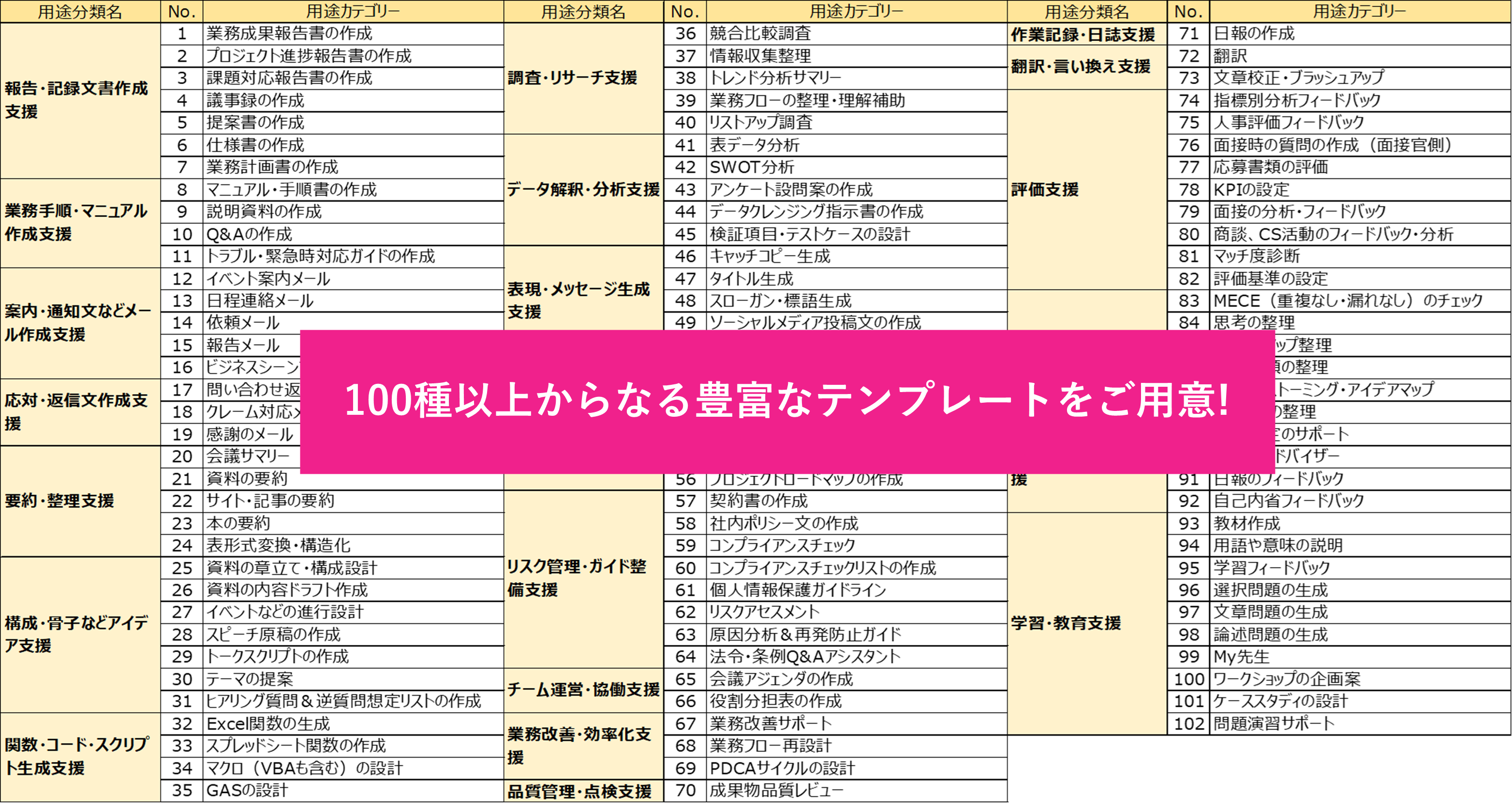 テンプレートは、用途・業界・職種の3軸で整理された100種以上